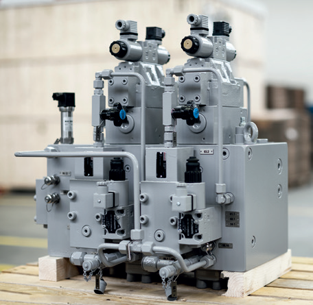 - Гидроцилиндры и гидросистема подъемной опоры самоподъемной модульной площадки СМП-03. Ввиду того, что четыре цилиндра, перемещающие опору, должны двигаться синхронно, в гидравлической системе предусмотрены датчики давления, при помощи которых, измеряя перепад давления в полостях каждого цилиндра, электронная система управления обеспечивает синхронное движение всех гидроцилиндров, компенсируя за счет сигнала обратной связи по перепаду давления ошибку в рассогласовании движения цилиндров.