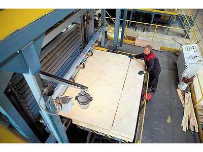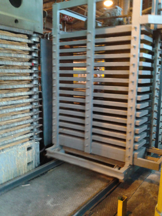 Пресс для производства фанеры П714Б содержит 15 «этажей», между которыми закладываются пакеты шпона. После загрузки пакетов в пресс требуется быстро сомкнуть плиты пресса, во избежание затвердевания клея, в противном случае выходная продукция будет иметь брак.