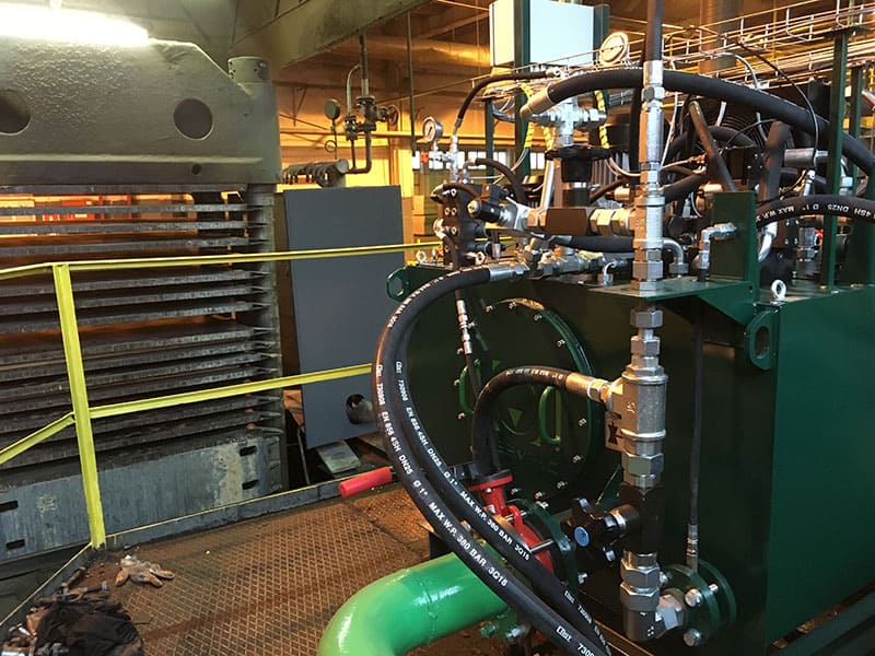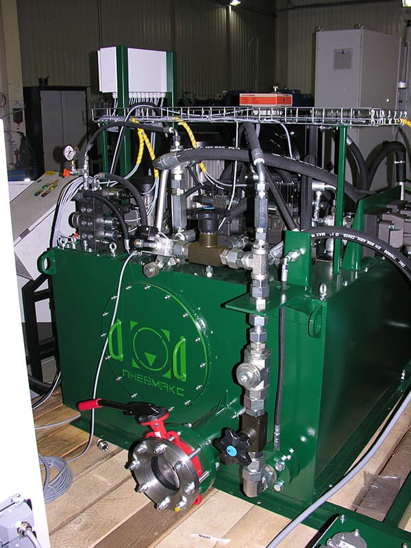 Гидравлическая станция состоит из гидробака объемом 1200 литров, основного насоса регулируемого с расходом в 150 л/мин, насоса управления с расходом 9,1 л/мин, давление 200+50 бар, двигатели 30+1,1 кВт.