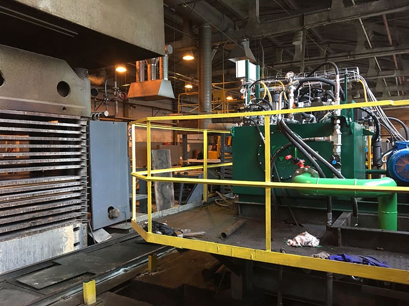 Станция пресса состоит из бака объемом 1200 литров, основной насос является регулируемым с максимальным расходом 150 литров в минуту, также установлен насос управления с расходом 9,1 л/мин.