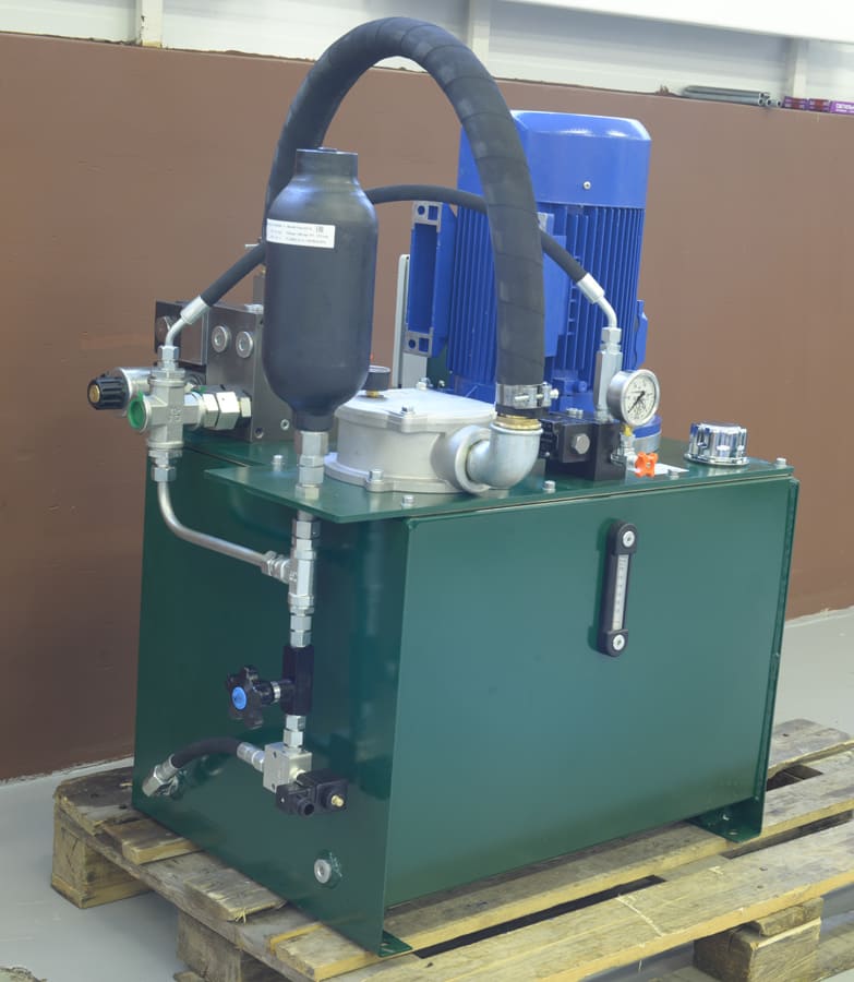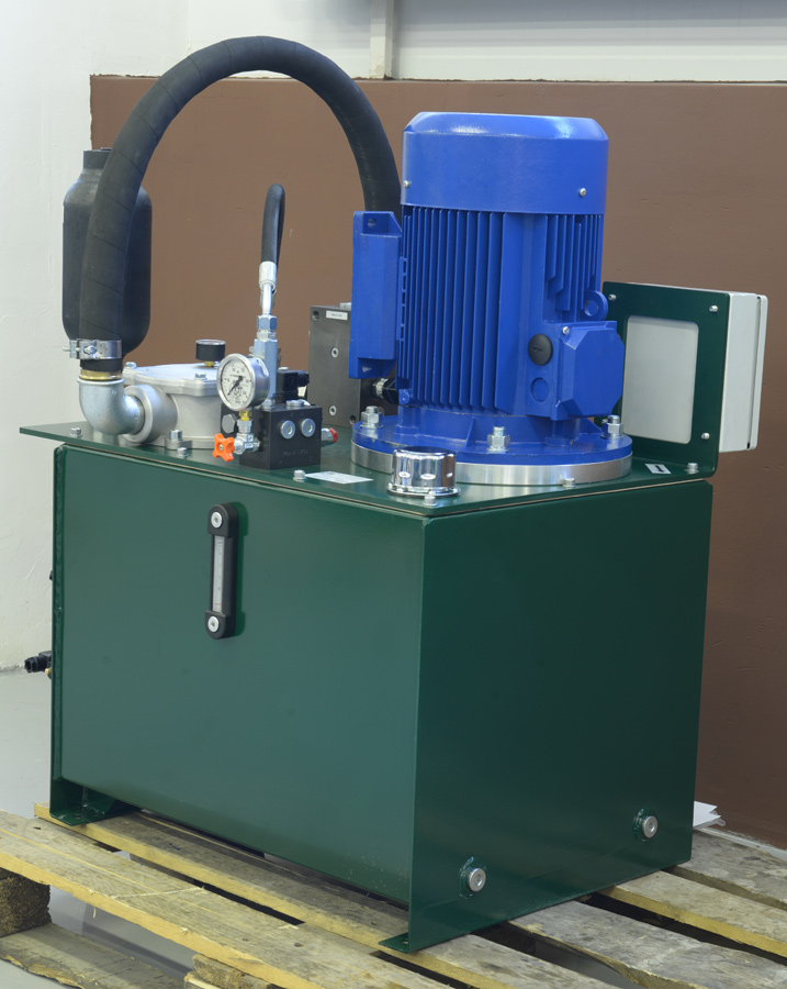 Маслостанция представляет собой стальной гидробак объёмом, достаточным для обеспечения нормальной работы гидросистемы с данным расходом, с вертикально-расположенной мотор-насосной группой. Бак оснащён визуальным указателем уровня масла, воздушным фильтром (сапуном), отверстием с пробкой для слива рабочей жидкости, также на баке установлен сливной фильтр, предназначенный для очистки масла. Фильтр оснащен предохранительным (by-pass) клапаном, защищающим фильтр от поломки при загрязнении фильтрующего элемента и визуальным индикатором загрязнения. Крутящий момент от электродвигателя передается насосу через кулачковую муфту с демпфирующей проставкой, что снижает уровень шума при работе аппарата. Электродвигатель крепиться к насосу при помощи «колокола».