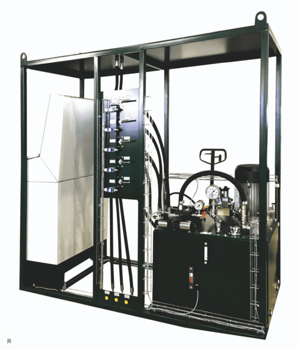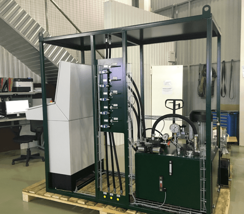 - Конструкция гидростанции выполнена таким образом, чтобы обеспечить ее встраивание в существующее помещение и обеспечить безопасность оператора при проведении испытаний. Для корректного проведения испытания необходимо давление до 400 бар, чтобы достичь такого давления в гидростанции применен мультипликатор давления с коэффициентом усиления 1:7.