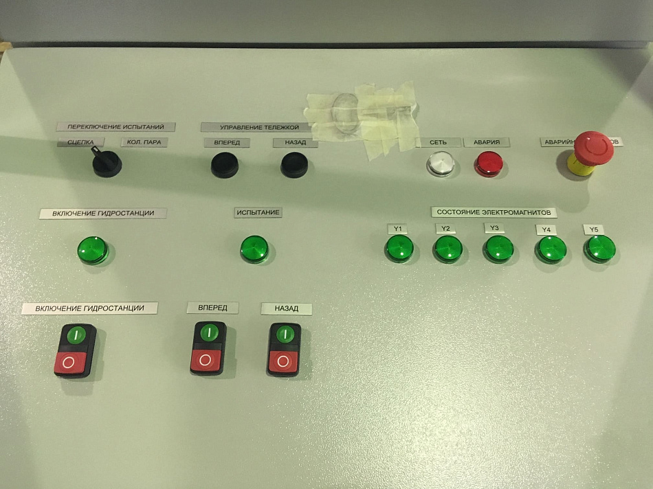 - Поскольку, при проведении испытаний могут быть задействованы два независимых силовых гидроцилиндра, а управление обоих гидроцилиндров осуществляется от одних и тех же магистралей, то выбор гидроцилиндра осуществляется с помощью ручных кранов с электронной фиксацией их положения, что обеспечивает дополнительную страховку от ошибок оператора.