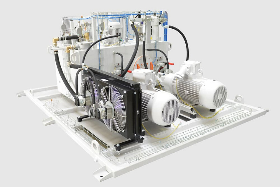 Гидравлическая схема разработана в соответствии с требованиями заказчика и последними тенденциями развития гидравлических устройств общепромышленного оборудования. Установленная гидравлическая аппаратура взаимозаменяема с современными аналогами зарубежных и отечественных производителей. Всё оборудование выполнено во взрывозащищённом и низкотемпературном (до -41° С) исполнении. Все металлические поверхности прошли дробеструйную обработку и специальную многослойную окраску (грунт PRIM PLATINA + эмаль PRIM URETAN Coat PM). Гидростанция рассчитана на продолжительный режим работы - 24/7.