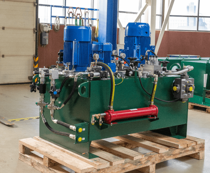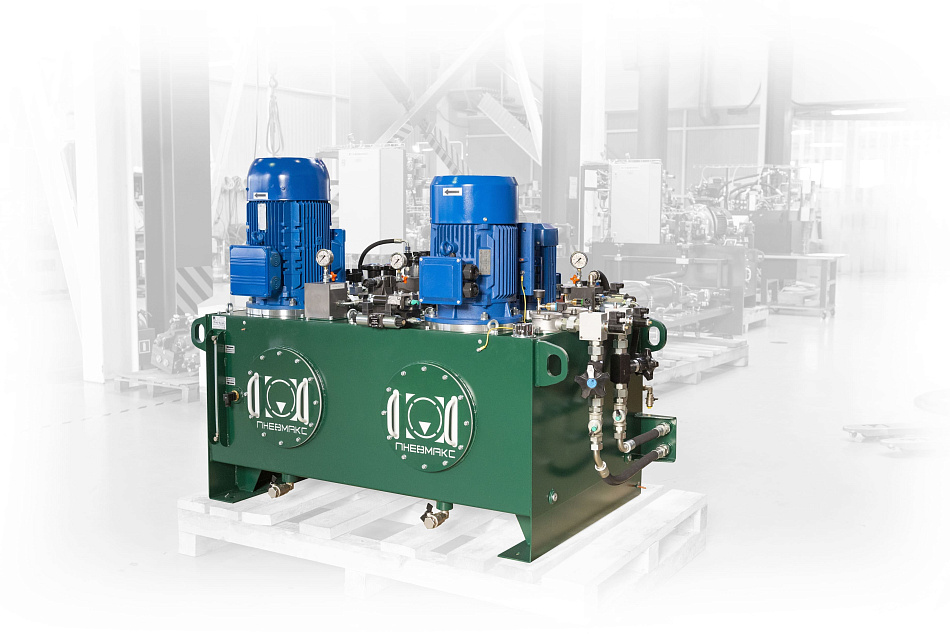 В качестве основного силового агрегата использована мотор-насосная группа с аксиально-поршневым насосом. Маслостанция представляет собой стальной гидробак объёмом, достаточным для обеспечения нормальной работы гидросистемы с данным расходом, с вертикально-расположенными мотор-насосными группами. Бак оснащён визуальным указателем уровня масла, воздушным фильтром (сапуном), отверстием с пробкой для слива рабочей жидкости, также на баке установлен сливной фильтр, предназначенный для очистки масла.