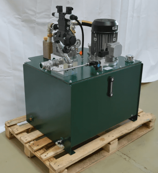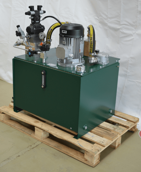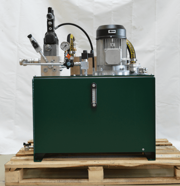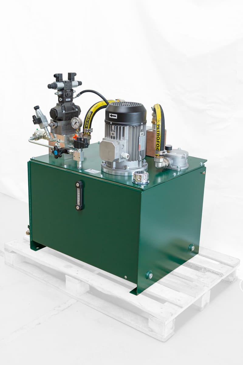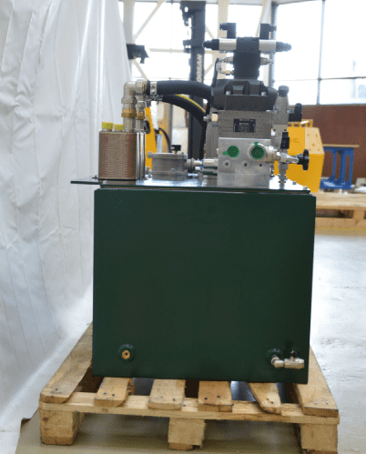 В состав гидростанции входит непосредственно гидравлическая силовая установка, гидроблок управления, установленный на крышку бака, и система управления. В составе гидростанции имеются два насоса: высокого и низкого давления. Насосы работают на одну магистраль, их соединение осуществлено через разделительную панель, которая обеспечивает разгрузку насоса низкого давления по достижению давления 30 бар. Есть возможность регулировки скорости движения главного гидроцилиндра с помощью дроссельных регуляторов.