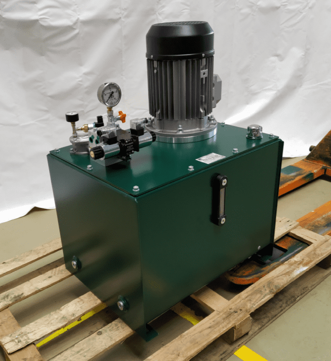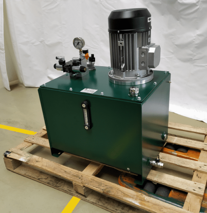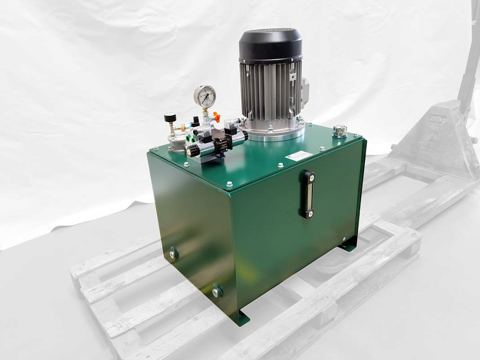В состав гидростанции входит непосредственно гидравлическая силовая установка, гидроблок управления, установленный на крышку бака и вспомогательные элементы. Для обеспечения надежного удержания гидроцилиндров от самопроизвольного опускания, установлен двухсторонний гидрозамок.