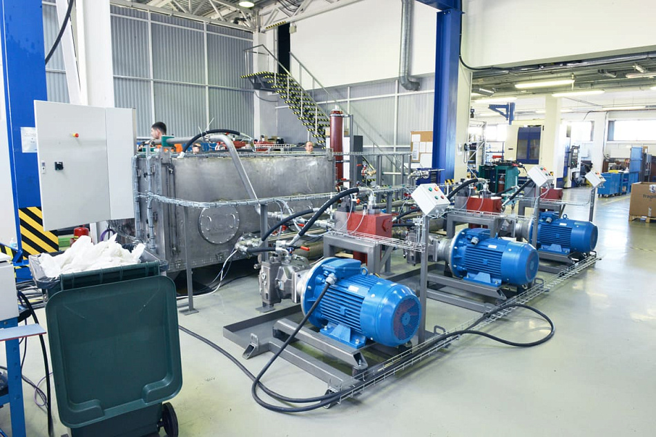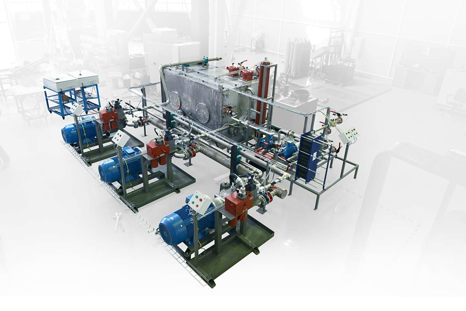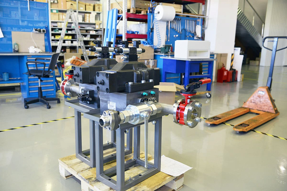 Для обеспечения "мягких" переходных процессов, в напорной магистрали установлен пневмогидравлический аккумулятор баллонного типа объемом 55 литров. Система управления обеспечивает работу в ручном и в автоматическом режимах, а также связь с системой управления верхнего уровня. Запуск электродвигателей насосов возможен от индивидуальных пультов управления. Гидростанция рассчитана на продолжительный режим работы - 24/7.