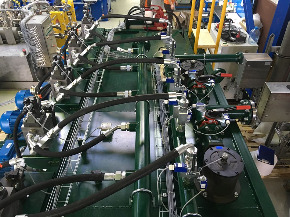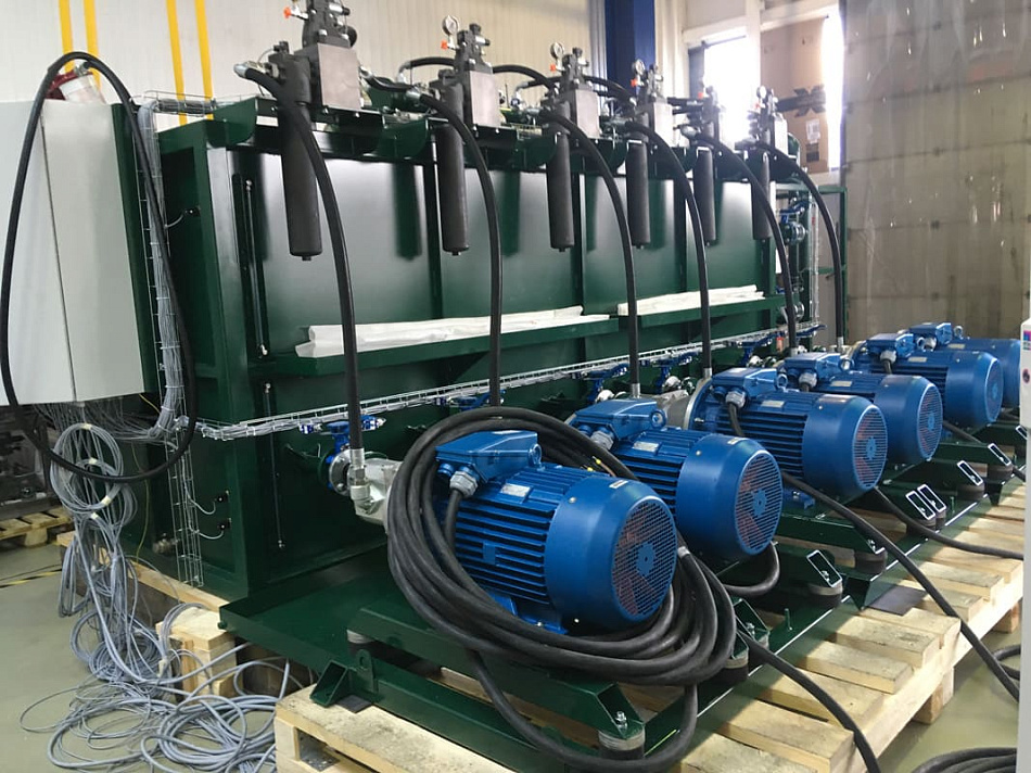 На каждом шаровом кране установлены датчики положения для удаленного мониторинга их состояния. В качестве основного и резервного силовых агрегатов использованы шесть мотор-насосных групп, каждая из которых состоит из нерегулируемого шестеренного насоса и электродвигателя. Гидростанция рассчитана на одновременную работу до 6 мотор-насосных групп.