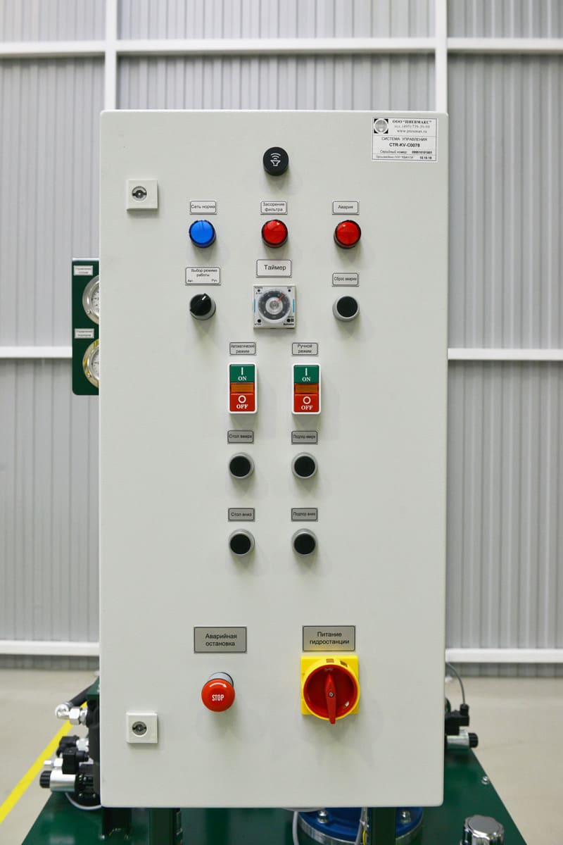 Гидростанция рассчитана на продолжительный режим работы - в течение одной смены (8 часов) в сутки. Управление гидростанцией осуществляется от встроенной системы управления, расположенной на одной раме с гидростанцией. На шкафу управления расположены переключатели режимов работы (ручной / автоматический), кнопки управления для ручного управления механизмами, ручной таймер выдержки под давлением, лампы аварийных ситуаций, звуковая сигнализация.