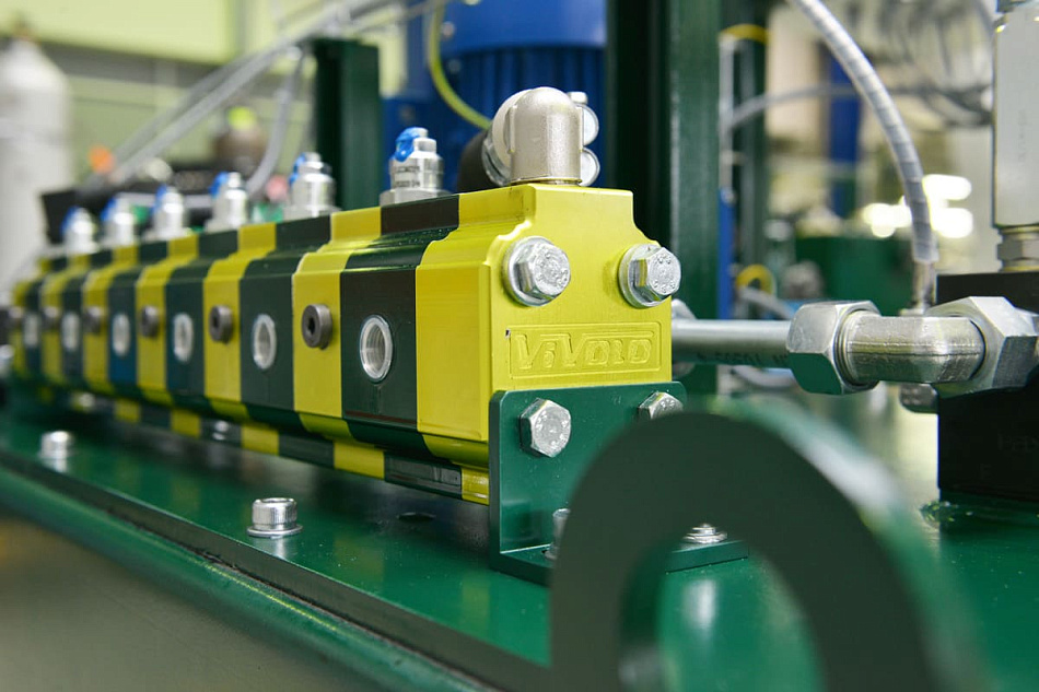 Для синхронизации движения гидроцилиндров подпоров, на гидростанции установлен шестисекционный шестеренный делитель потока. На делителе потока на каждой секции установлены дополнительно предохранительные и антикавитационные клапаны. Для надежного удержания подпоров и их плавного опускания установлен тормозной клапан, настройка скорости движения подпоров осуществляется с помощью дроссельных регуляторов с ручным управлением. Контроль давления в гидроцилиндрах подпора и подъема стола осуществляется с помощью реле давления.