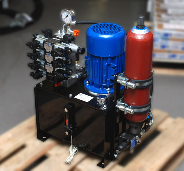 CTR-KV0466 - Насосная станция в составе гидробак объемом 10 литров, двигатель асинхронный мощностью 0,37 кВт, шестеренный насос с подачей 1,6 л/мин, рабочее давление до 120 бар, в сборе с аппаратурой.