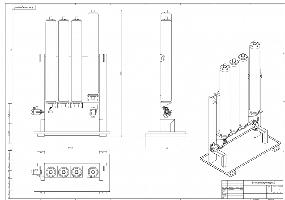 Аккумуляторный стенд предназначен для обеспечения гидросистемы большим расходом рабочей жидкости. Стенд состоит из баллонных гидроаккумуляторов с предохранительными блоками, обратных клапанов. В предохранительных блоках установлены манометры для контроля рабочего давления.