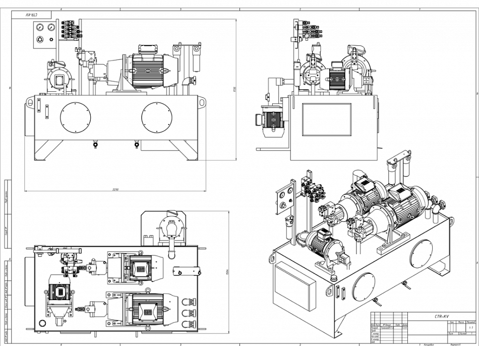 Электромоторы установлены на демпфирующих опорах; 1 мотор-насосную группу с нерегулируемым шестеренным насосом внутреннего зацепления; 3 обратных клапана, установленных в сливных магистралях, идущих из системы; 1 обратный клапан в напорной магистрали от насоса; манометр с переключателем с измерительными шлангами; гидроблок управления Тележкой смены кассет и Устройством смены инструмента.