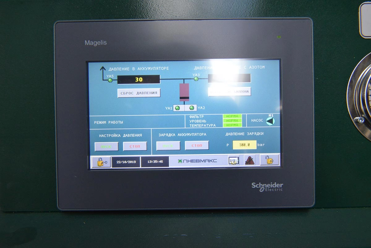 - Первый этап - аккумулятор заряжается до давления на 10-15 % больше требуемого значения.